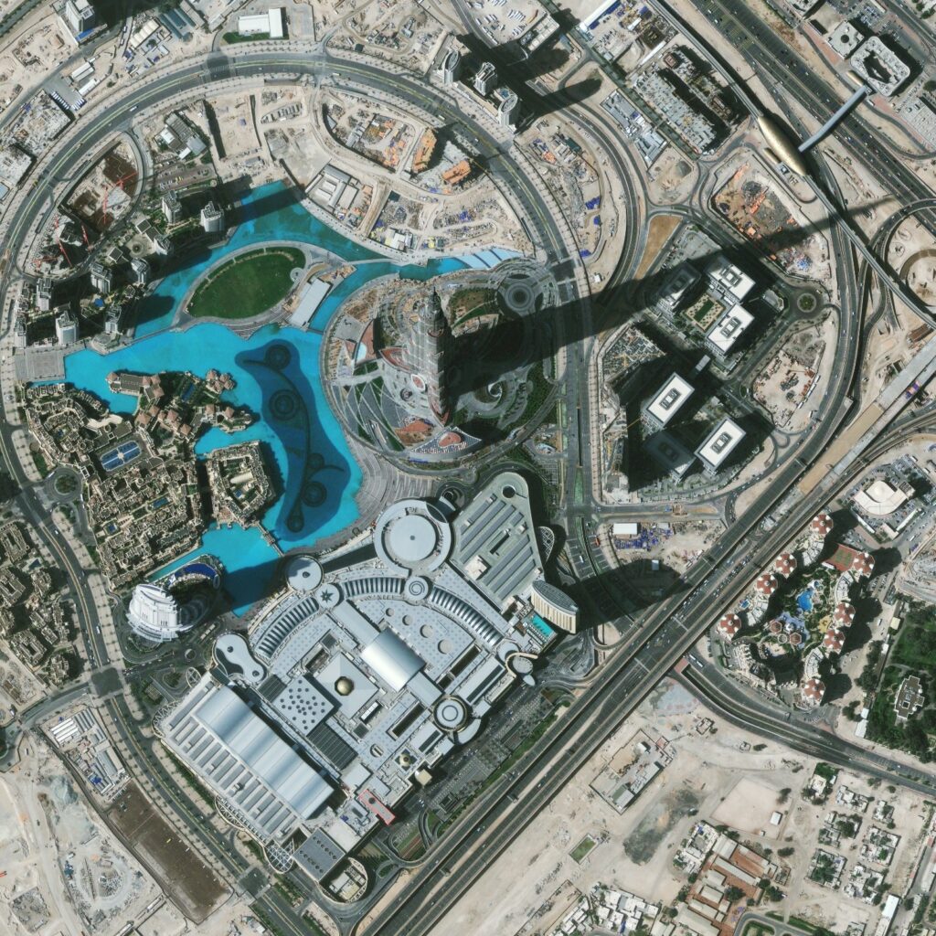 A stunning satellite view showcases the Burj Khalifa casting its colossal shadow across Downtown Dubai, framed by turquoise water features and precise urban design. The city’s bold architecture and vibrant landscape come together in a striking display of modern beauty.